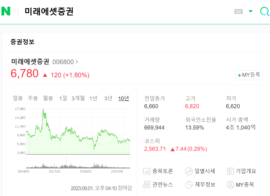 대한민국 샐러리맨의 신화 박현주 회장의 회사로 잘 알려져 있는 회사 미래에셋증권입니다.샐러리맨 출신으로 시가총액 4조를 만들어내다니, 정말 대단합니다. 10년 전 주당 10,000원에서 현재 6,700원 수준이네요. 30% 이상 하락입니다.