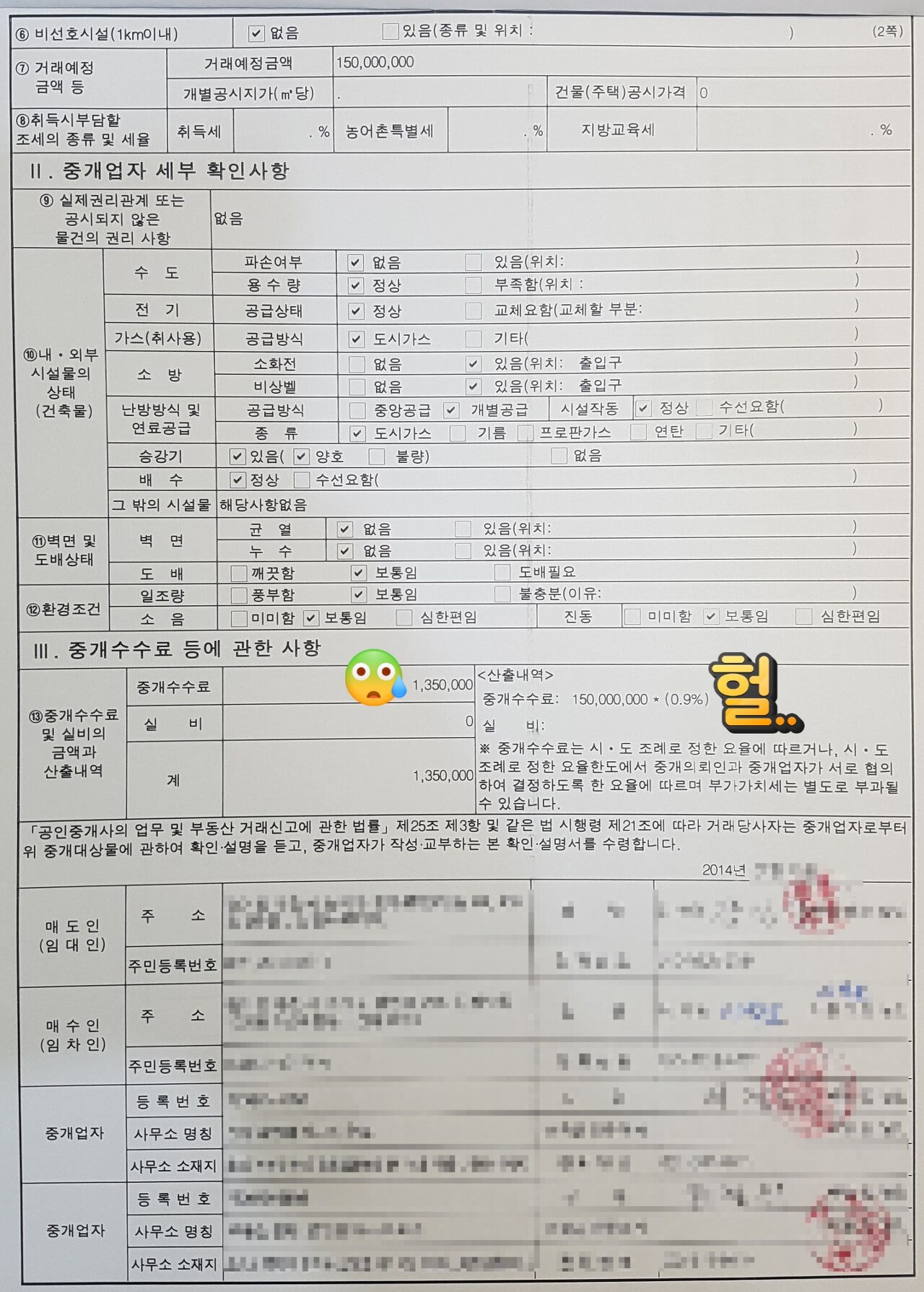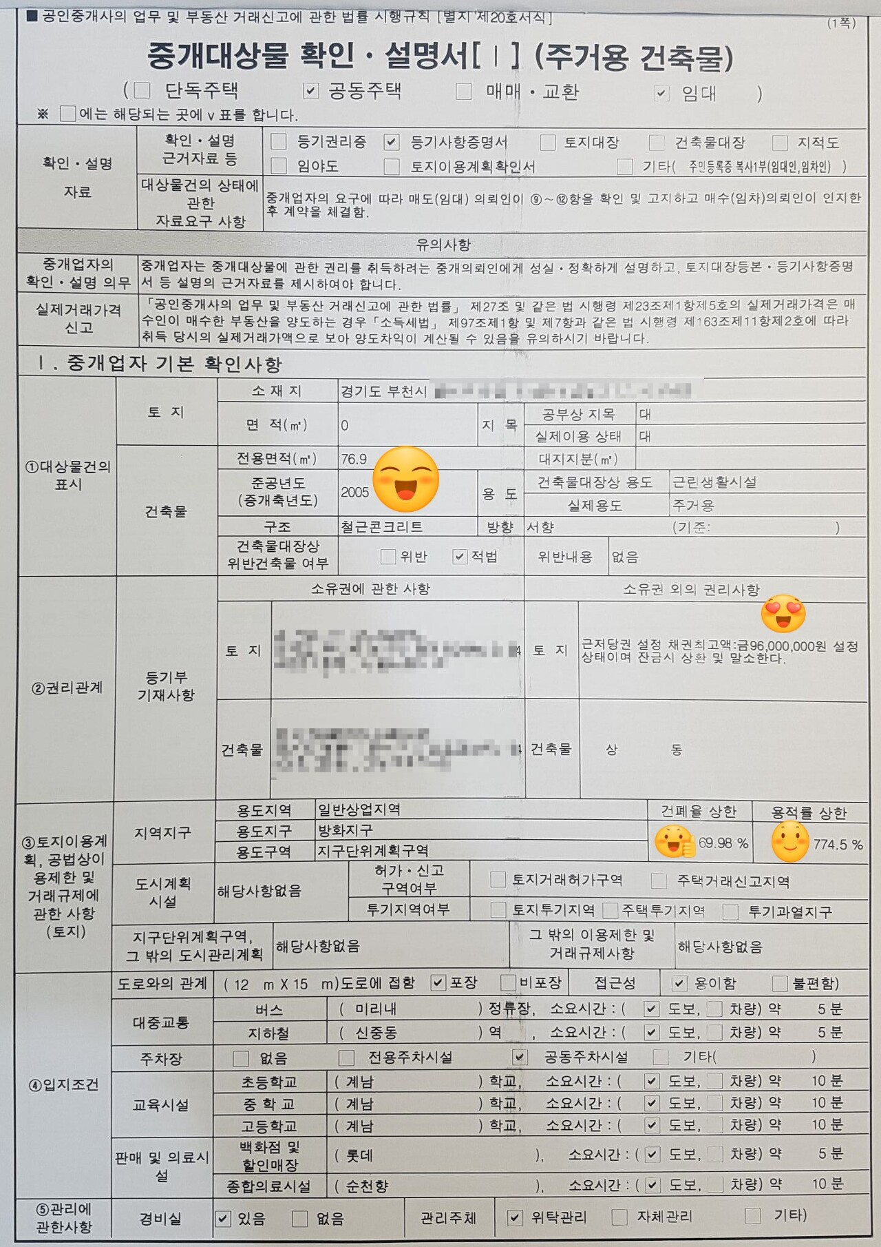 안녕하세요. 쿨가이 입니다. 경기도 부천역 부근의 전세 7,400만원, 전용 13평 수준의 단칸방 생활 2년 후, 조금 더 좋은 집으로 이사하였습니다. 벌써 10여년 전입니다. 아래와 같이 오피스텔 전세계약서와 중개대상물 확인,설명서 등이 남아있네요.