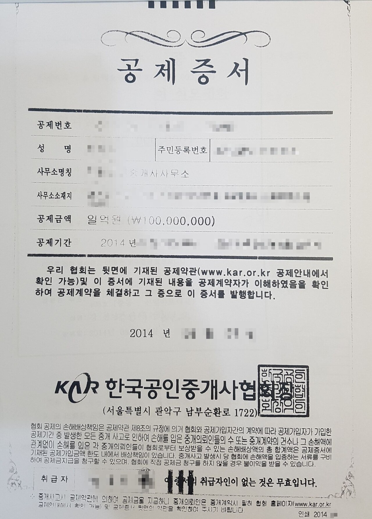 공인중개사를 통하여 계약하였습니다. (위 사진 공제증서)