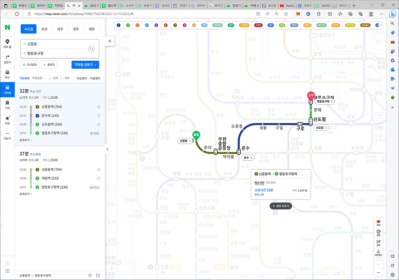 신중동역에서 직장이 있었던 영등포구청역 까지 지하철로는 약 40분 거리였습니다.(위 사진)