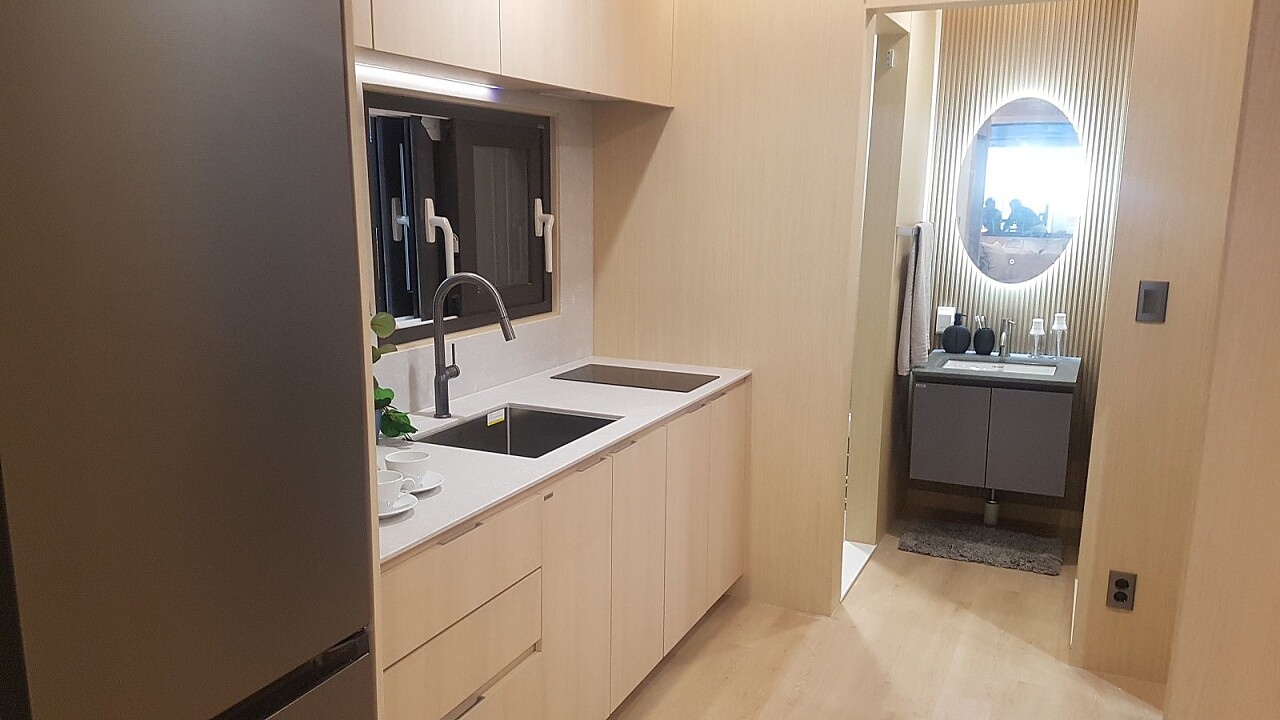 소형주택 제작 업체. 내부 주방 /건식 화장실.